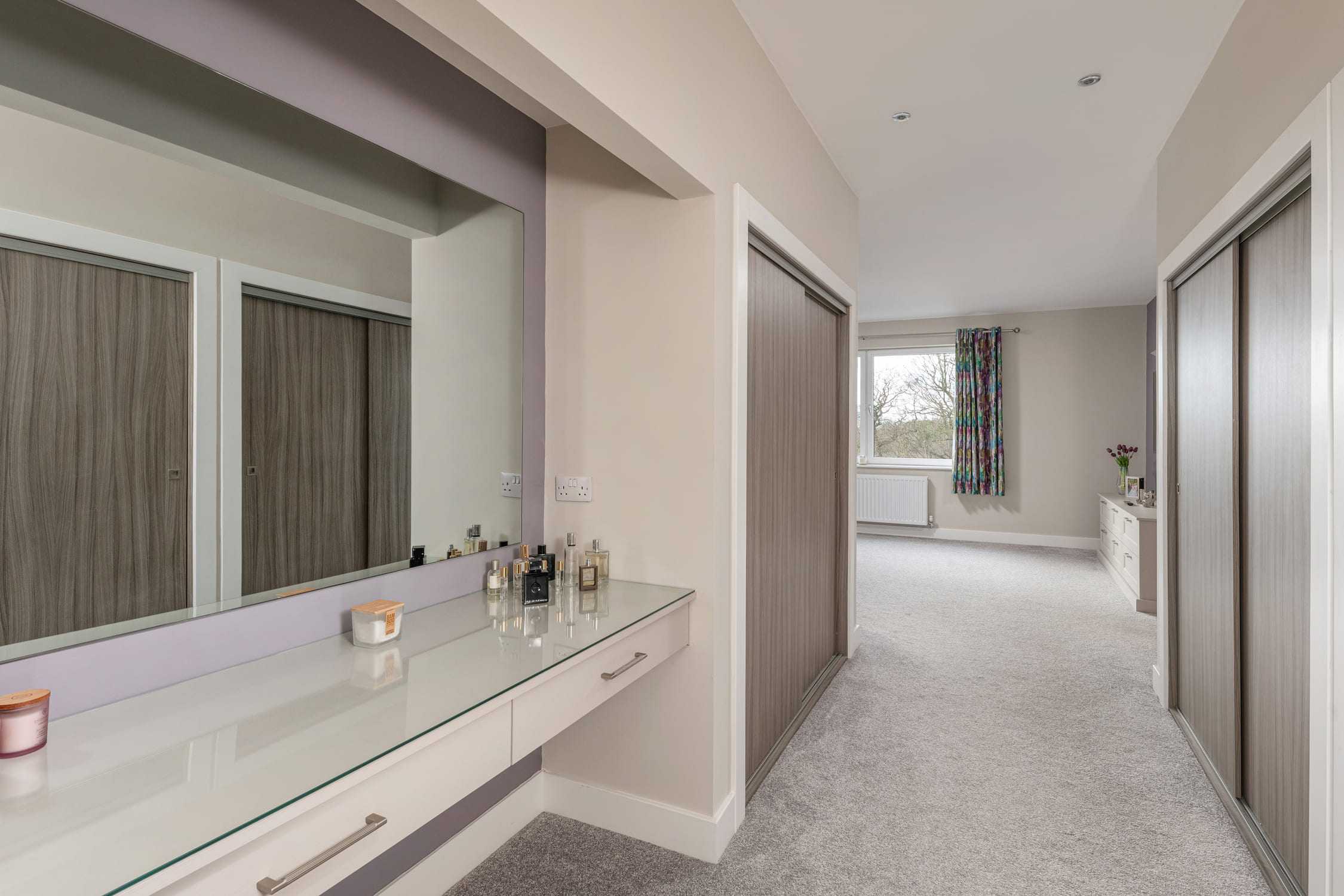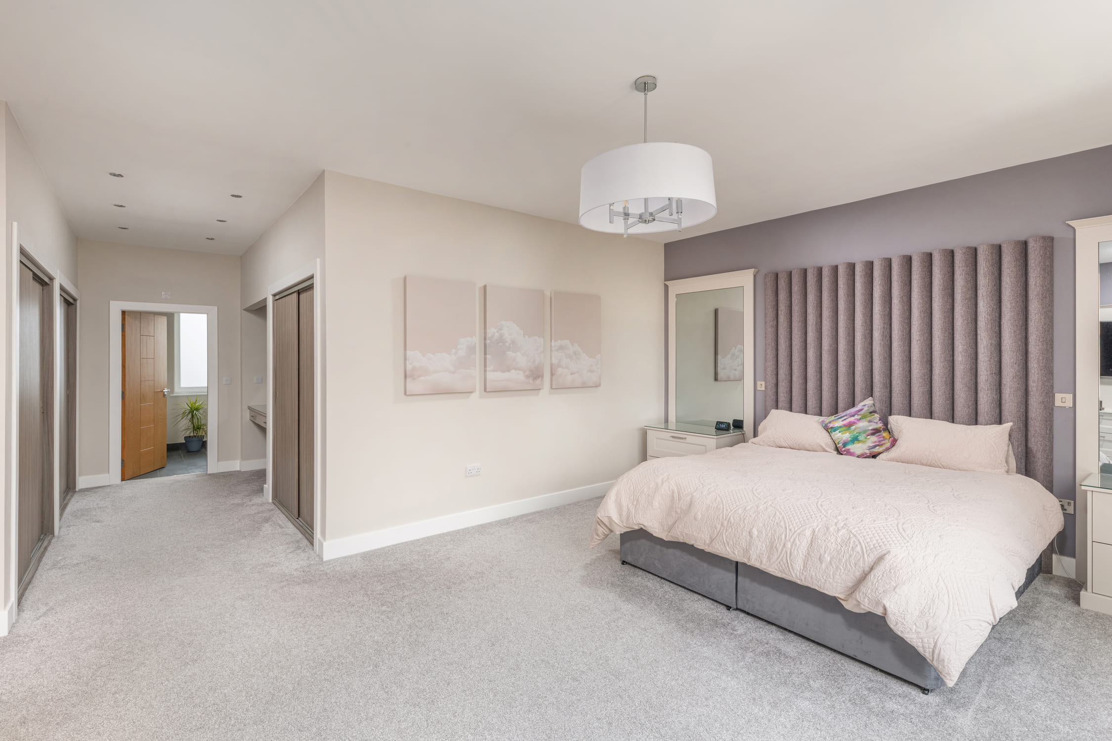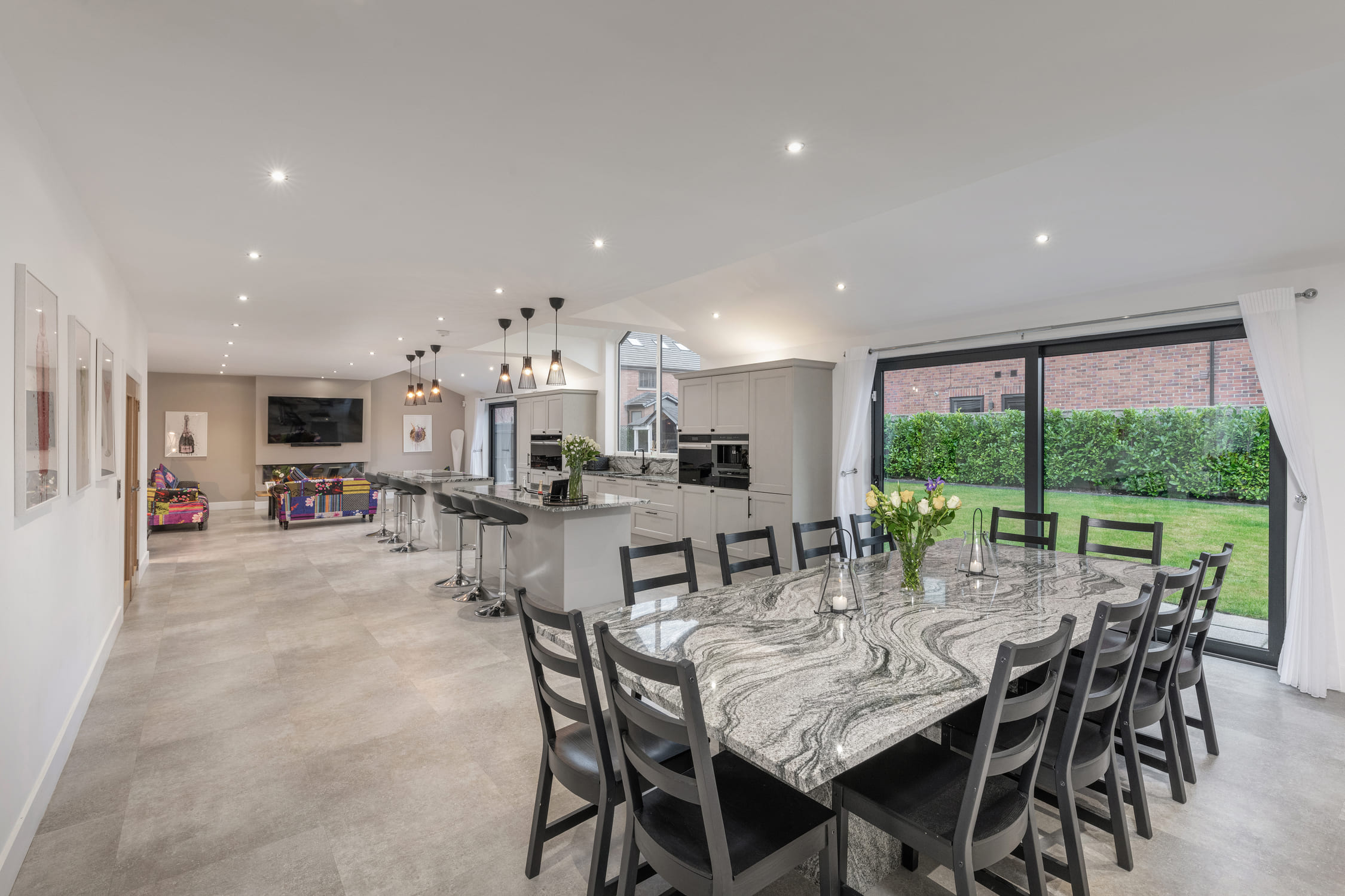 From the moment you step inside, the sense of scale and light is extraordinary. The entrance hall is framed by a sculptural feature staircase, setting the tone for the rest of the home. Flowing through to a spacious kitchen, dining and living area, the design balances family functionality with a sense of refinement. Every space has been thoughtfully proportioned, from the utility and boot rooms to the private lounge areas and beautifully appointed en suites that give each bedroom its own sense of luxury.